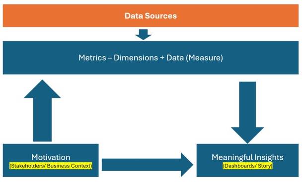Metrics = Dimensions + Measures — How do we model the data?. This step converts raw data into analytical structure. Dimensions → Describe data (Category, Region, Date, Customer) and Measures → Quantify data (Sales, Profit, Quantity, Time). Metrics are often derived measures: Profit Margin, Growth %, Average Delivery Time etc. Metrics define what is being measured. Analysis Flow (Top → Down Arrow): Once metrics are defined, analysis flows downward toward insights: Apply filters, Aggregate data, Compare segments, Identify patterns and anomalies etc. This is where: Charts, Calculations, Comparisons etc. happen.