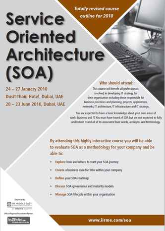 This course is designed to lead business and IT managers through the full range of current Service Oriented Architecture (SOA) concepts, thinking, best practice, methodologies, tools and architecture.